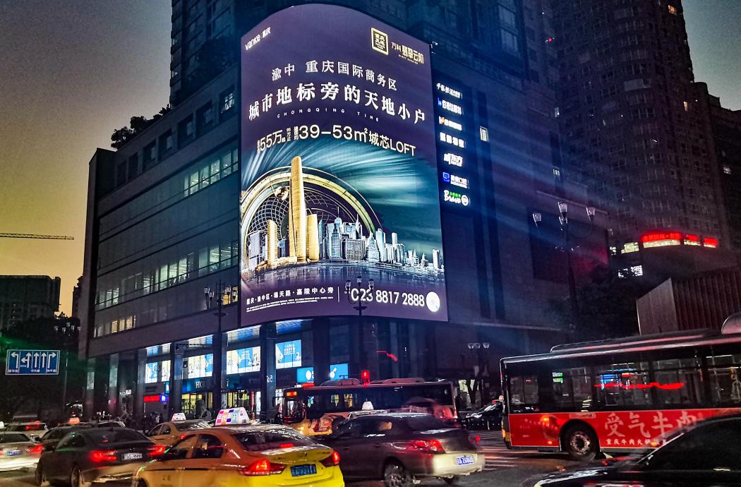 解放碑壹號(hào)屏坐落于解放碑CBD門(mén)戶,合景聚融廣場(chǎng)幕墻,左側(cè)為進(jìn)出解放碑車流 量最大的十字進(jìn)階——解放碑步行街。