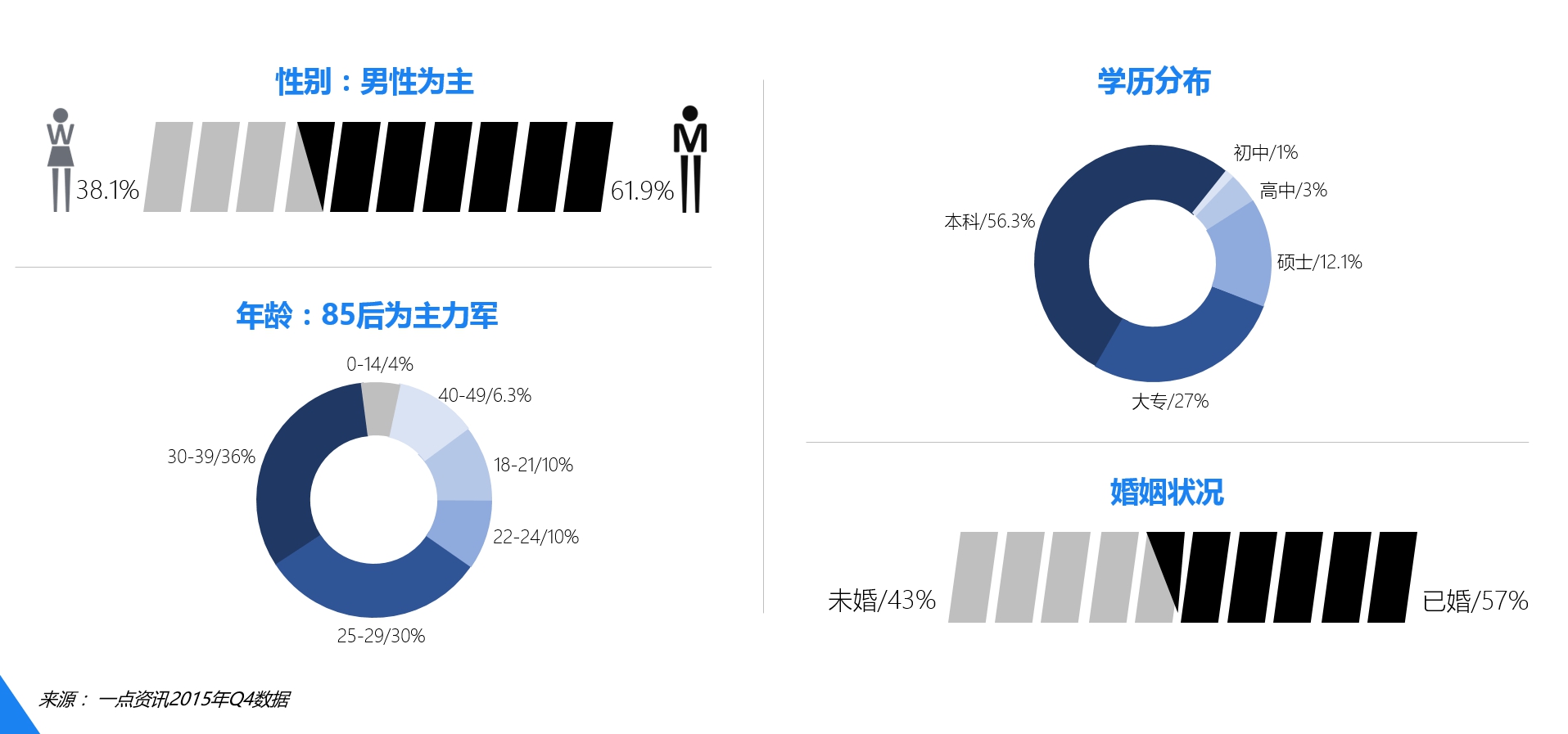 (3)年輕高端。一點資訊的用戶大部分集中在21-40歲之間,90后用戶群占據(jù)主導,擁有潛在主流消費群體,白領(lǐng)、高學歷、高收入人群居多。