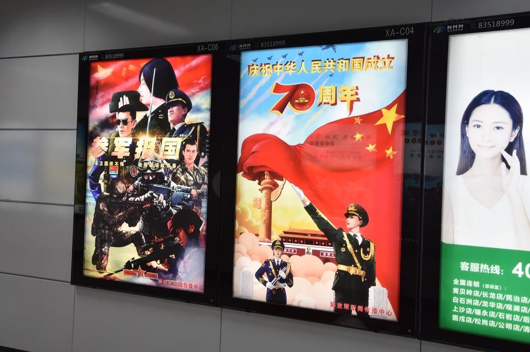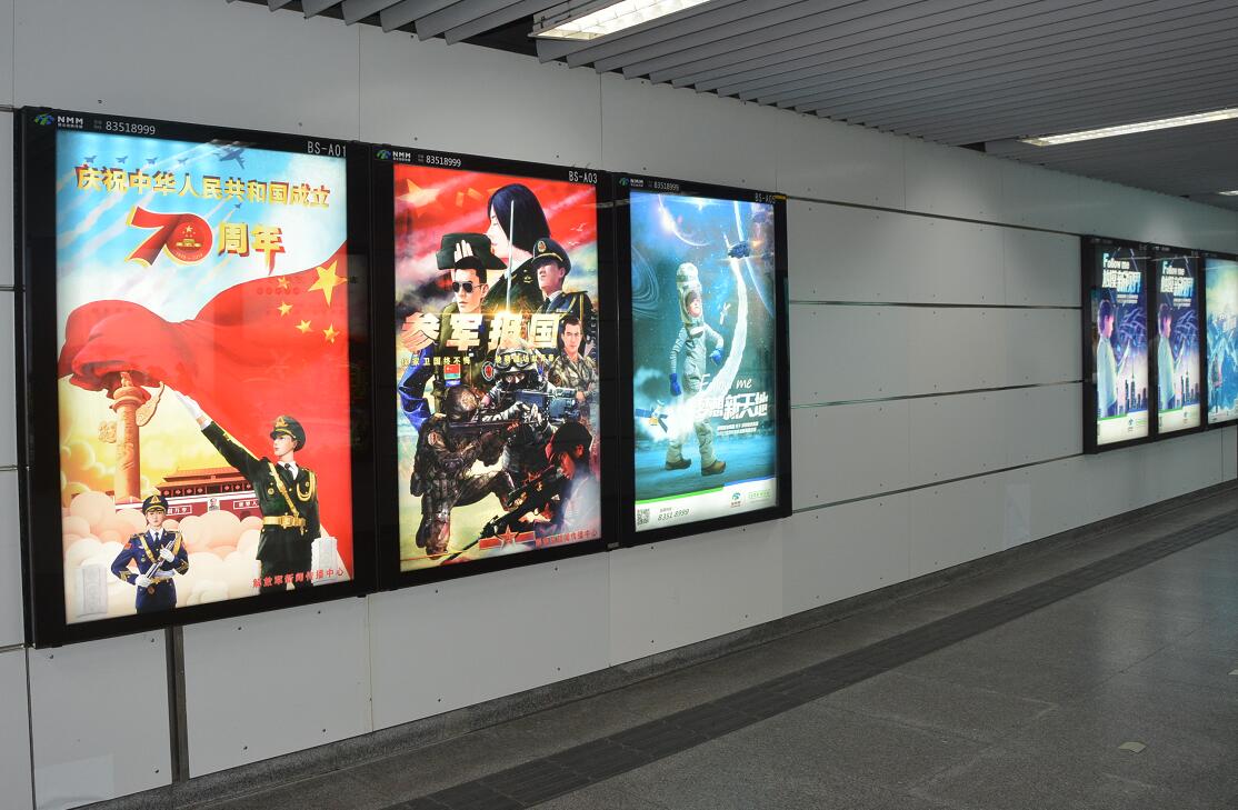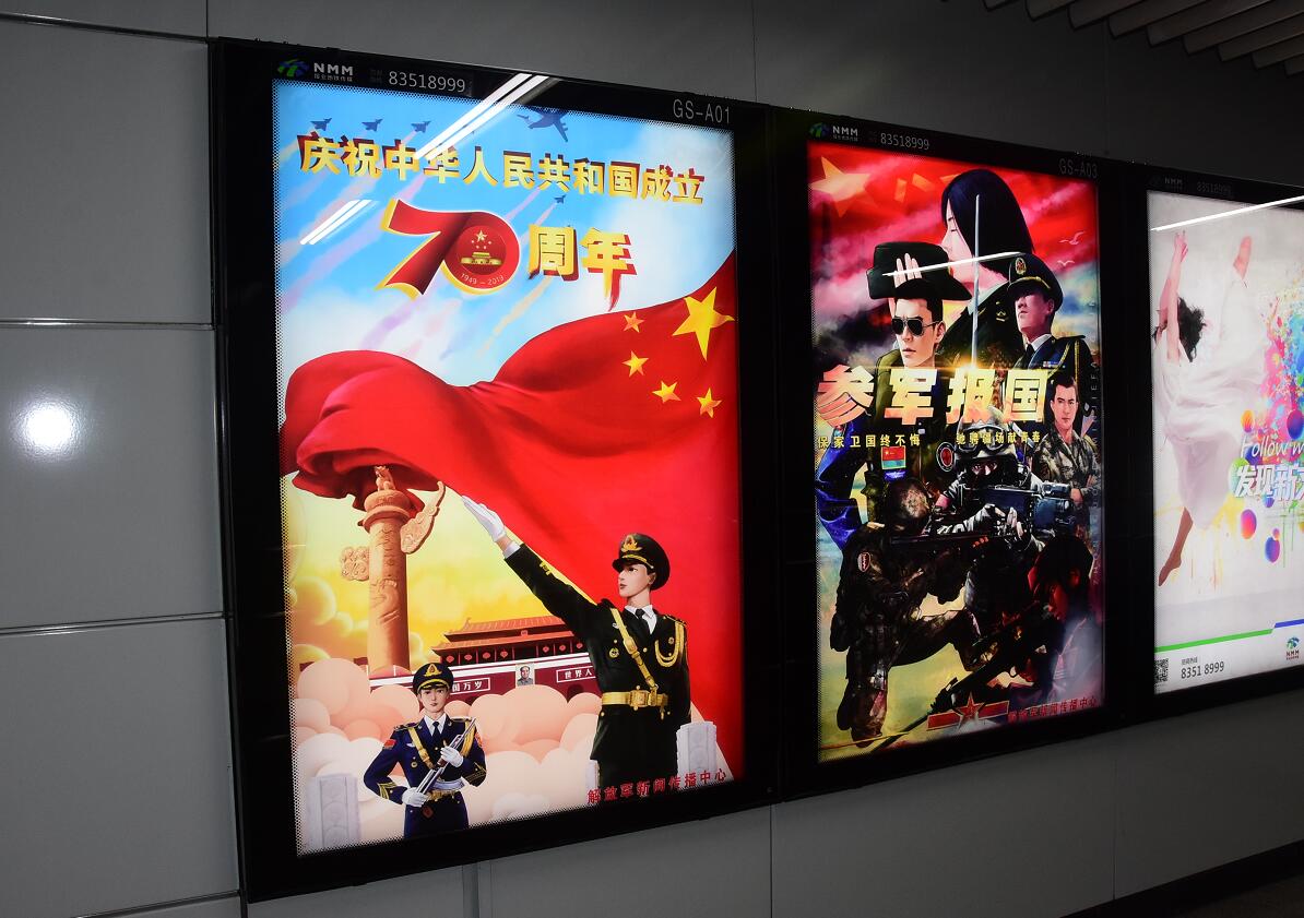 七十年光輝歲月彈指揮間,七十年中華大地滄桑巨變。我們偉大的祖國迎來了她的七十歲生日。我們的祖國從唐朝的繁榮興盛,到清朝的受侮挨打;從民國時的懦弱腐敗,到今天的輝煌榮耀,歷經千辛萬苦,終于屹立世界的前方,向全世界人民展出中國的獨特的東方魅力。國家強大,離不開人民軍隊,為此通過地鐵燈箱受眾人群較大,號召廣大適齡青年依法服兵役,踴躍參軍報國,積極投身強軍偉業,為祖國的繁榮昌盛貢獻自已的一份力量。此次宣傳做為媒體公司承載著光榮使命,經過幾個月的努力,在國慶七十周年來臨之際,用不同的方式表達對祖國的祝福。
