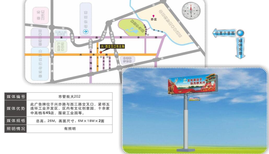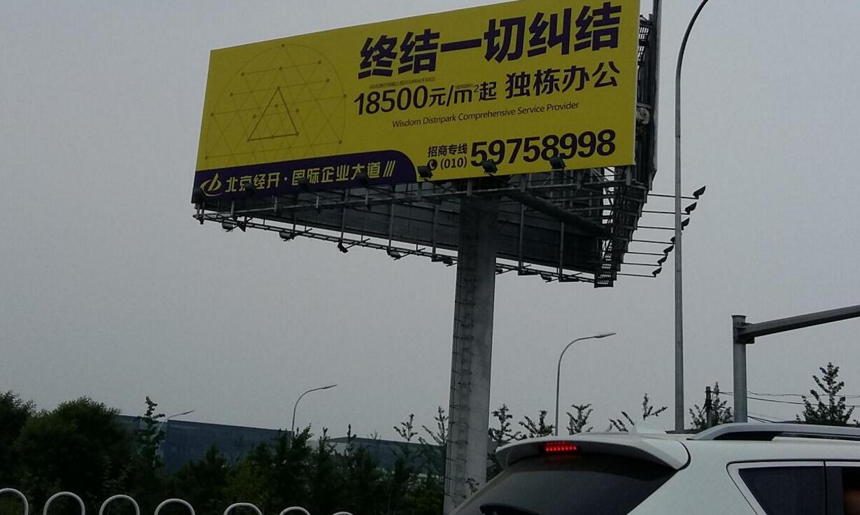 | 亦莊單立柱廣告 媒體位置:G2京津出入口亦莊開發(fā)區(qū)入口、亦城國(guó)際B座樓體 媒體形式:亦莊三面翻 媒體規(guī)格:30m*5m ? 27m*8m 媒體報(bào)價(jià): 備注:開發(fā)區(qū)大企業(yè)形象宣傳(房地產(chǎn)除外) |