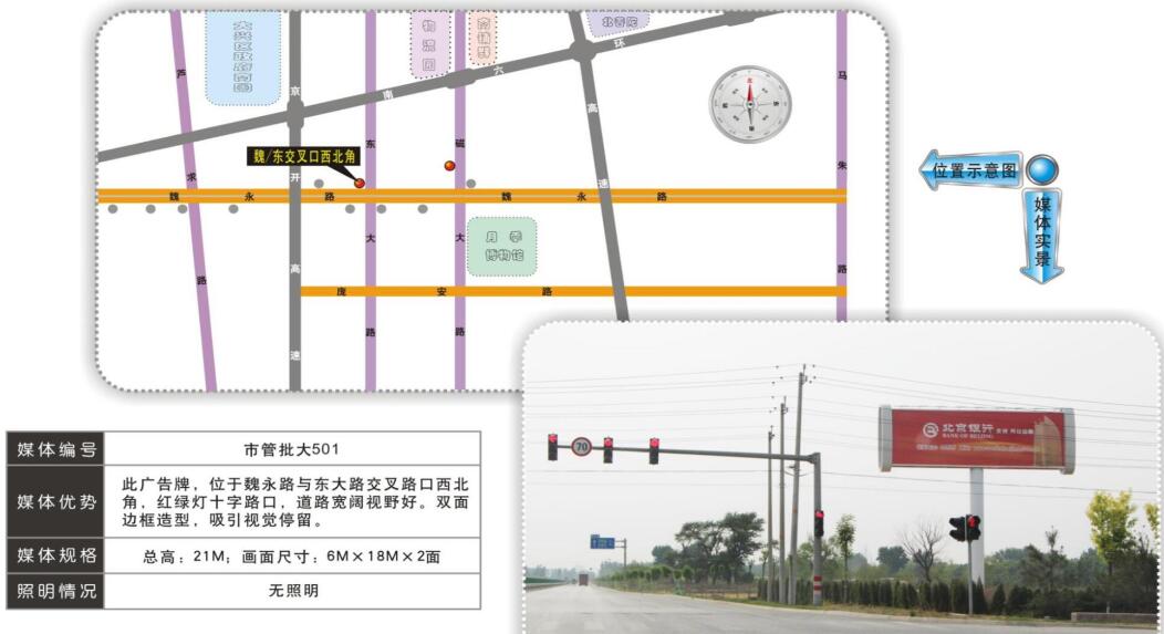 | 亦莊雙面單立柱廣告 媒體位置:榮華北路、榮華南路、西環(huán)北路、東區(qū)科創(chuàng)五街 媒體規(guī)格:12m*4m*2面 |