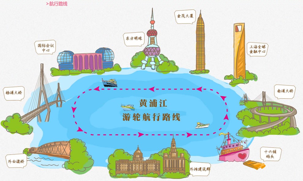 乘船游覽,途經(jīng)外灘萬國建筑博覽群、陸家嘴金融貿(mào)易區(qū)、蘇州河、國際客運中心等。