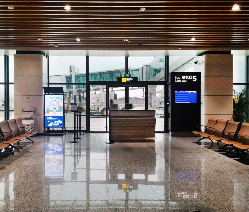 LED液晶在旅客登機(jī)口通道旁,候機(jī)廳人流密集。