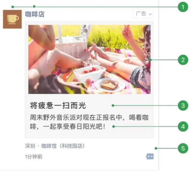1. 廣告主頭像昵稱:用戶點(diǎn)擊可直接跳轉(zhuǎn)廣告主公眾號(hào)介紹頁;2. 外層圖片、小視頻;3. 外層文案標(biāo)題(可選);