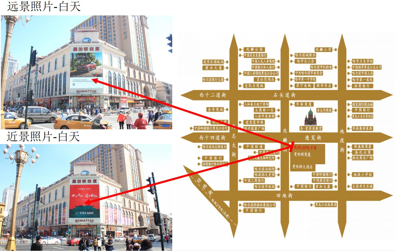 •此LED顯示屏位于道里繁華商圈,臨近麥凱樂、新一百商場、中央大街、透籠國際商品城等,并與多家金融機(jī)構(gòu)相毗鄰,在消費(fèi)者的購物活動過程中,動態(tài)視頻可在最接近進(jìn)行購物決定時施加最后的影響。