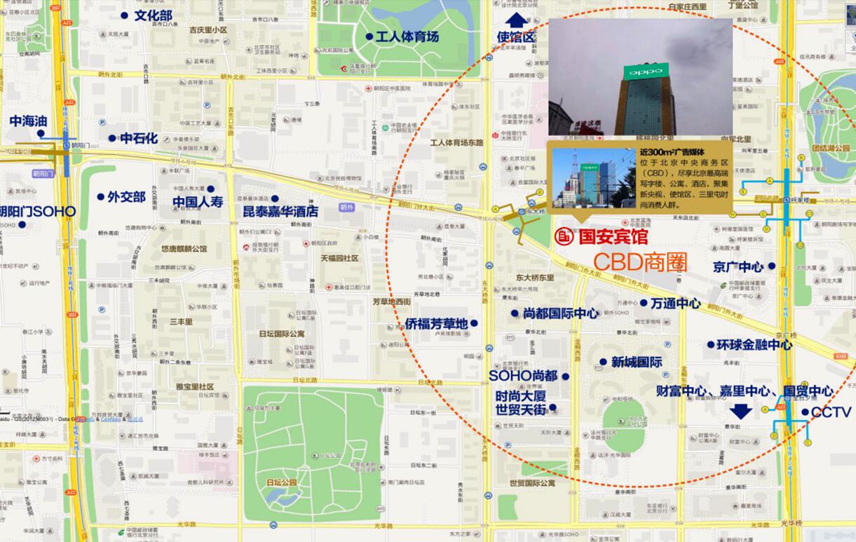 媒體效果、介紹:CBD國安大廈位于朝陽門外大街的黃金地段--朝陽門外大街關東店北街1號、中信國安大廈樓頂,直面工體東路、東大橋路、朝陽路、朝陽門外大街及朝陽北路交匯的五岔路口,地理位置優越。